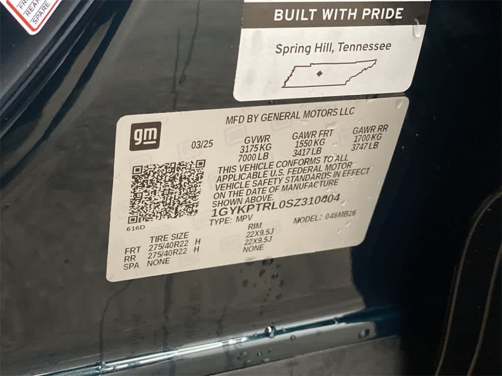 PROPULSION, ELECTRIC, AWD, DUAL MOTOR (Cadillac estimated 515 hp and 450 lb-ft of torque. Includes 7000 lb. GVWR, (CTT) Hitch Guidance, (PZ8) Hitch View and (V92) Trailering provisions.), LPO, FLOOR LINER PACKAGE includes (CAV) Integrated cargo liner, LPO and (RIA) Contoured floor liners, LPO. Rear Spoiler, MP3 Player, Keyless Entry, Remote Trunk Release, Alarm.